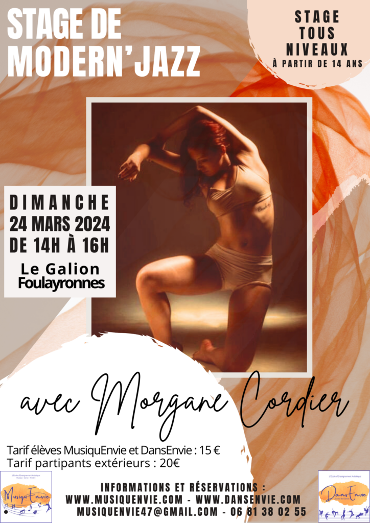 Morgane Cordier vous propose un stage de Modern’Jazz le dimanche 24 mars de 14h à 16h.